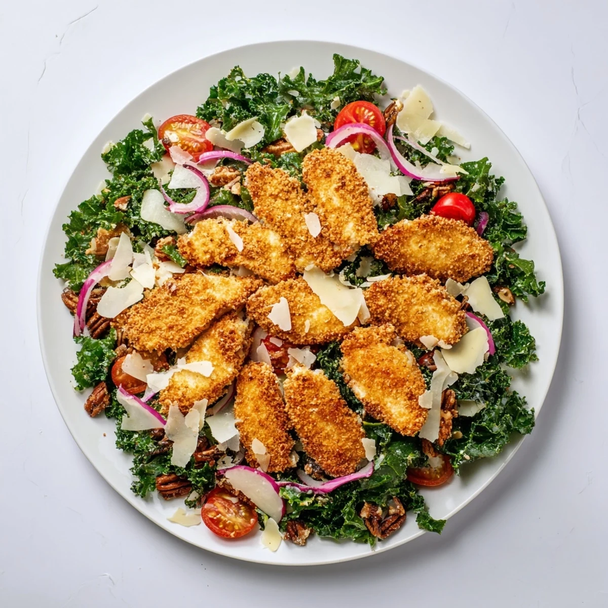 Ein köstlicher Salat, der knusprig gebratenes Hähnchen mit zartem, massiertem Kale kombiniert. Das goldbraun frittierte Hähnchen wird in Panko-Panade gewendet und auf ein Bett aus frischem Kale, Kirschtomaten und roten Zwiebeln serviert.