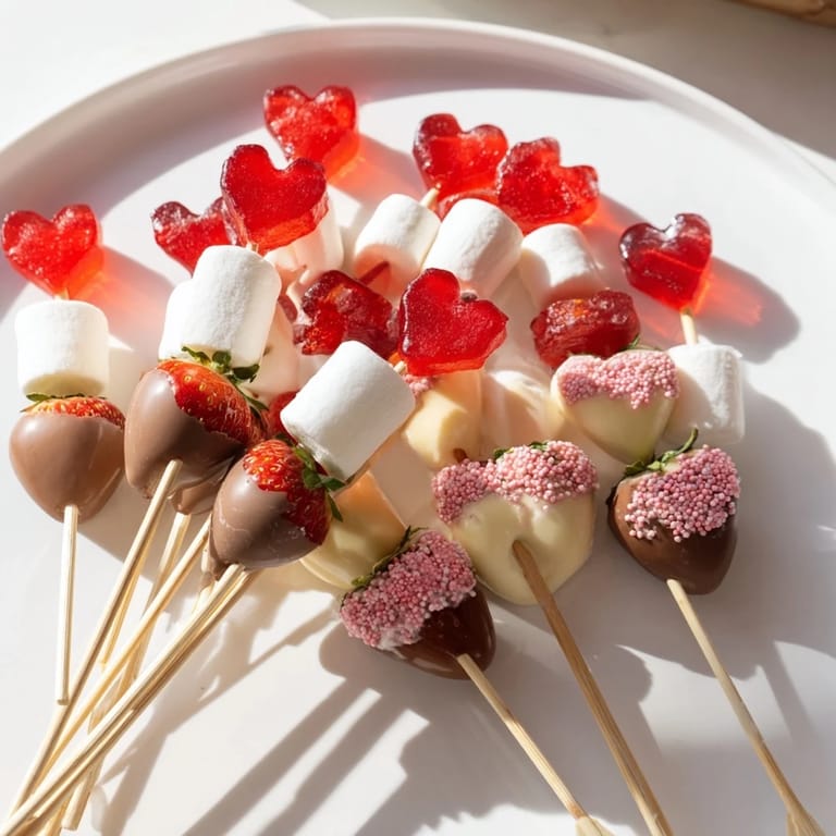 - Schokolade und Süßigkeiten: 200 g Vollmilchschokolade, geschmolzen, 150 g weiße Schokolade, geschmolzen, 24 herzförmige Gummibonbons, 12 Schokoladentrüffel, 8 große Erdbeeren, 8 Mini-Marshmallows