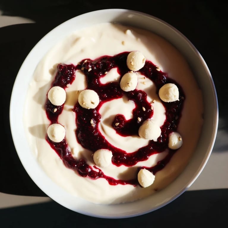 Dieses elegante Dessert kombiniert cremigen griechischen Joghurt mit dunkler Beerenmarmelade, die spiralförmig eingerührt wird. Kleine Kugeln aus weißem Ziegenkäse ergänzen das Aroma und sorgen für eine frische Note. Sesamsamen geben einen dezenten Crunch, während optional Honig zusätzliche Süße bringt. Schnell zubereitet, beeindruckt es optisch mit einem kosmischen Muster. Perfekt als leichter Genuss mit besonderer Optik.