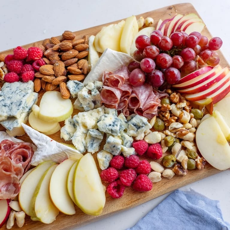 Käse in gleichmäßigen Abständen platzieren, dann die dünn geschnittene Charcuterie locker zwischen den Käsestücken einfügen. Frische Früchte und Nüsse füllen die Zwischenräume für ein harmonisches Gesamtbild.