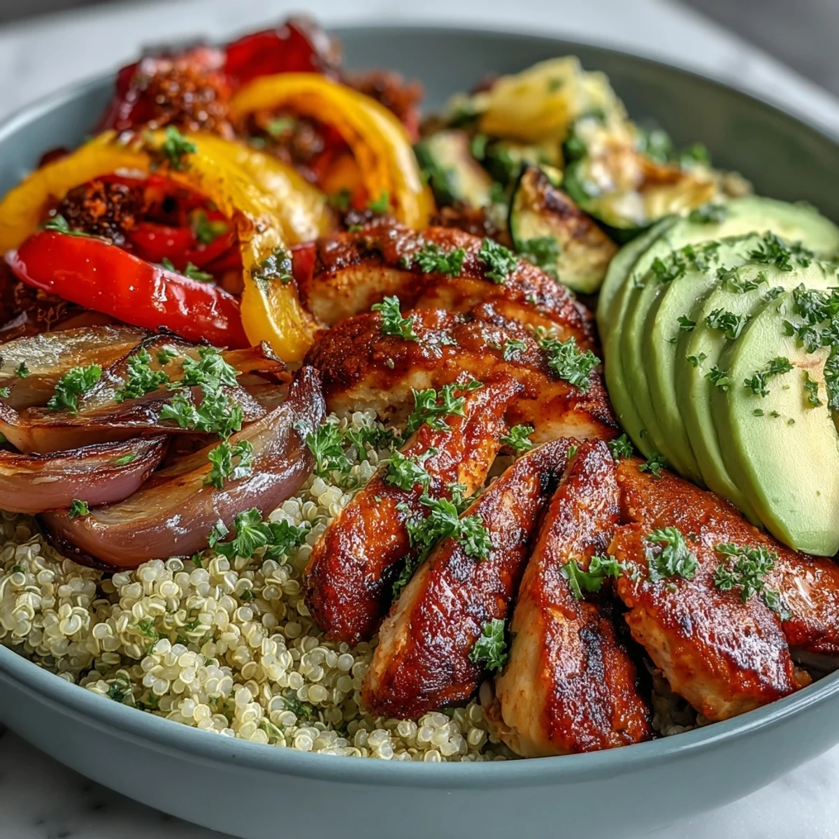Diese vielseitige Schale vereint knusprig geröstetes Paprikagemüse mit lockerem Quinoa, goldbraun gebratenem Hähnchen und erfrischendem Zitronensalat. Die cremigen Avocados runden das Geschmackserlebnis perfekt ab. Das Raucharoma der Paprika verleiht dem Gericht eine besondere Tiefe, während der Zitronensalat für eine angenehme Frische sorgt.