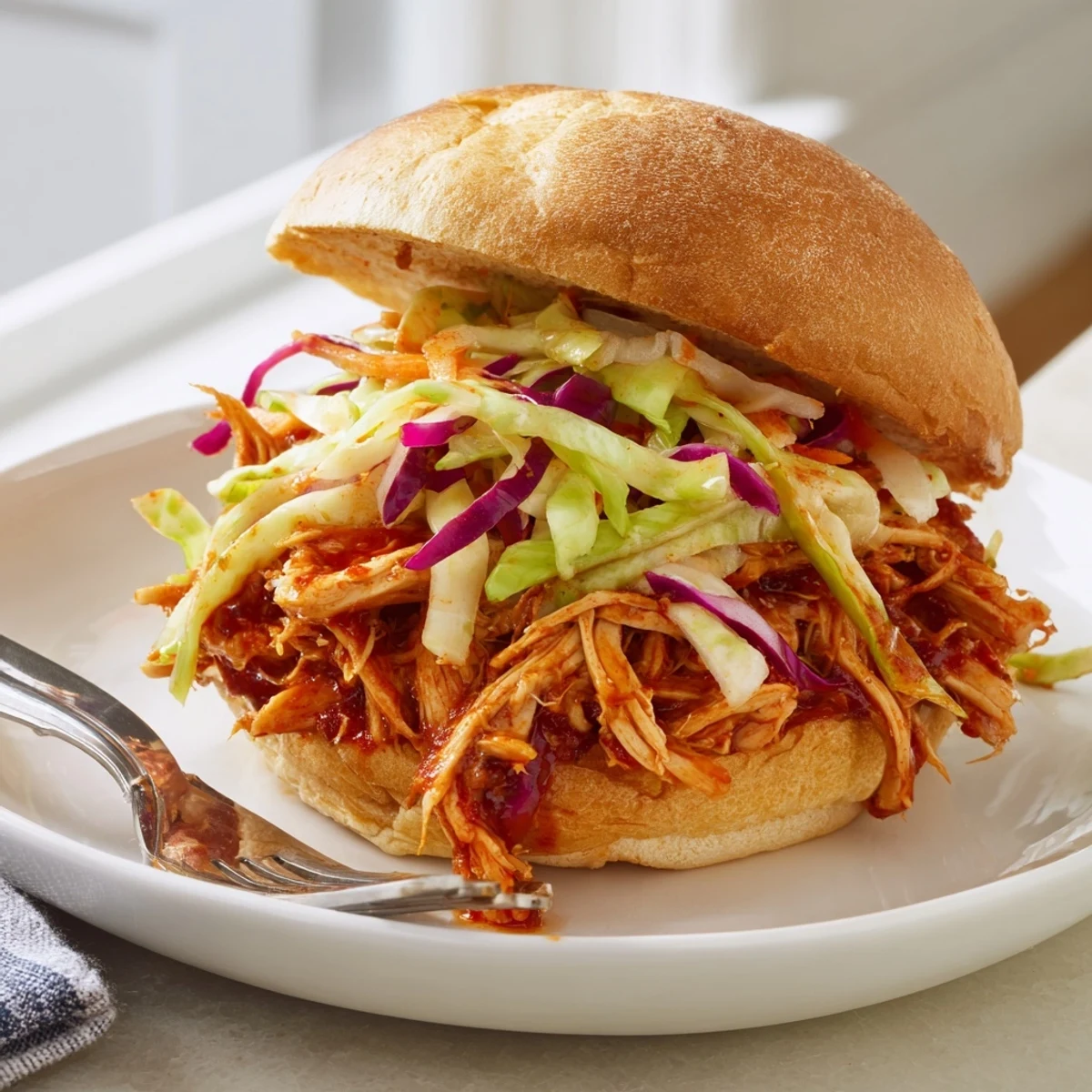 - Häufe das gezogene Barbecue-Hähnchen auf die unteren Brötchenhälften, gib großzügig Krautsalat darauf und setze die oberen Hälften auf. Serviere sofort, solange alles noch warm ist.