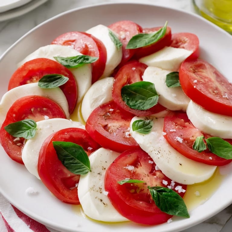 - Gemüse & Käse: 3 große reife Tomaten, in ½-Zoll-Ringe geschnitten, 250 g frischer Mozzarella, ebenfalls in ½-Zoll-Ringe geschnitten, 1 kleines Bündel frische Basilikumblätter