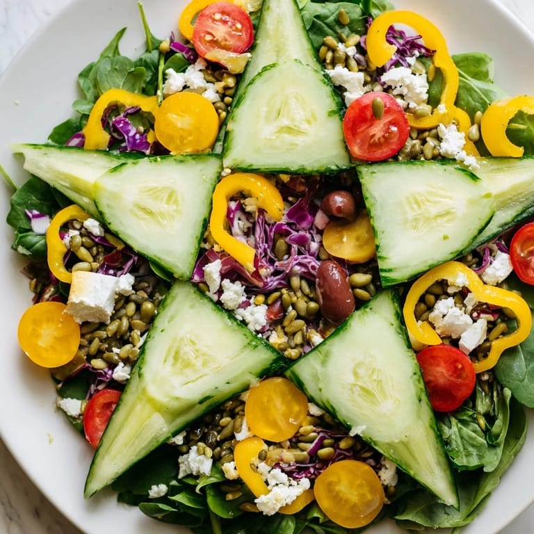 Merken Ich werde diese Salatplatte nie vergessen, als ich sie zum ersten Mal auf einem Tablett arrangierte und meine Tochter ausrief, dass der Davidstern wie Magie aussah. Es war nicht geplant, dass das Gemüse so perfekt zusammenpassen würde, aber während ich die Gurkenscheiben auslegte, erkannte ich plötzlich das Muster. Dieser Moment zeigte mir, dass Essen mehr als nur Geschmack ist, es ist auch Kunst und Freude auf einem Tablett.