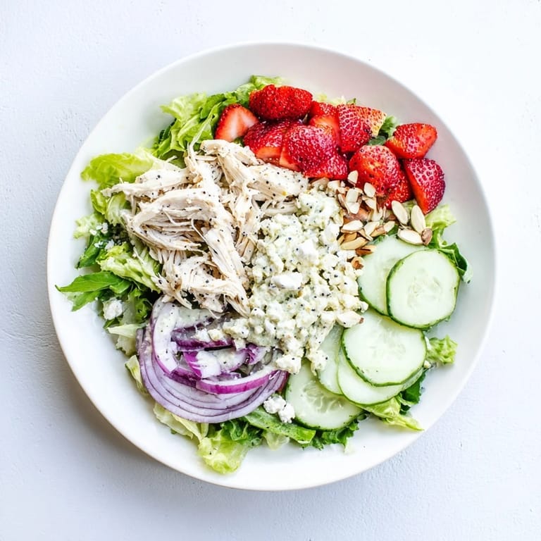 - In a large salad bowl, combine salad greens, shredded chicken, strawberries, cucumber, and red onion.