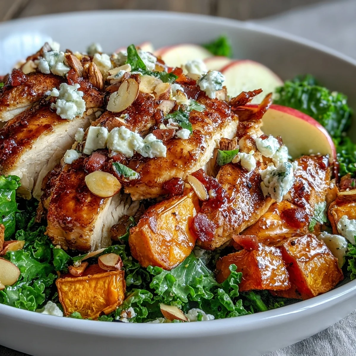 - To assemble: Divide kale among 4 bowls. Top with roasted sweet potatoes, sliced chicken, apple slices, crumbled goat cheese, and toasted almonds.