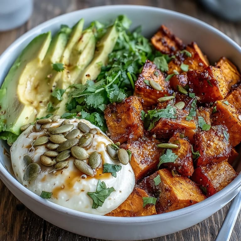 Crispy roasted sweet potato cubes paired with creamy avocado and cottage cheese in a vibrant Hot Honey Sweet Potato Bowl, drizzled with spicy-sweet honey. Merken