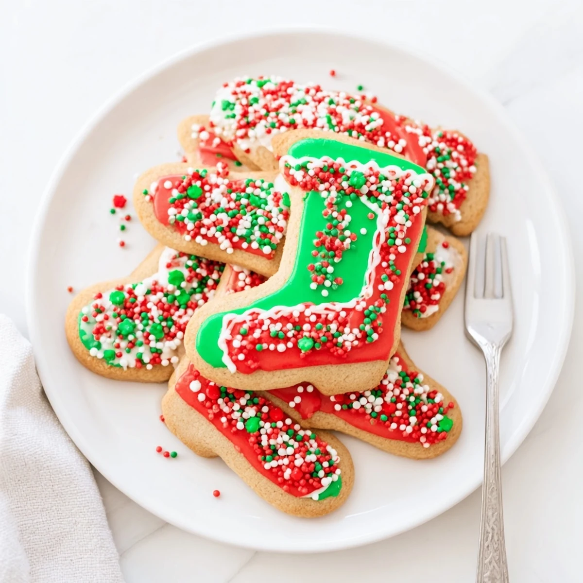 Merken Festliche, verspielte Kekse in Form von Weihnachtsstiefeln, perfekt für Feiertagsversammlungen. Diese buttrigen Vanillekekse sind mit buntem Zuckerguss für eine fröhliche Note dekoriert.