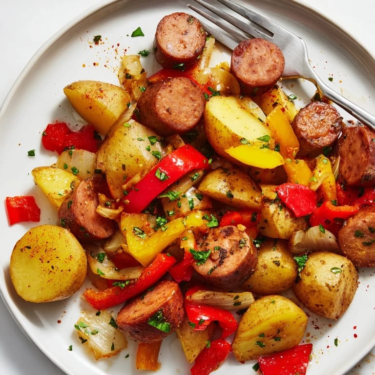 Merken Dies ist eine herzhafte Pfanne mit würziger Wurst, goldenen Kartoffeln und buntem Gemüse& perfekt für ein schnelles Abendessen unter der Woche.