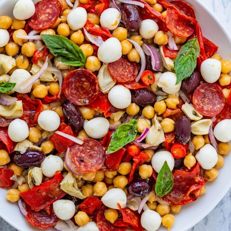 - Spüle die Kichererbsen unter kaltem Wasser ab und lass sie gut abtropfen, dann gib sie mit Mozzarella, Pepperoni, Tomaten, Paprika, Artischocken, Oliven, Zwiebel und Basilikum in eine große Schüssel. Es duftet schon jetzt nach Urlaub.