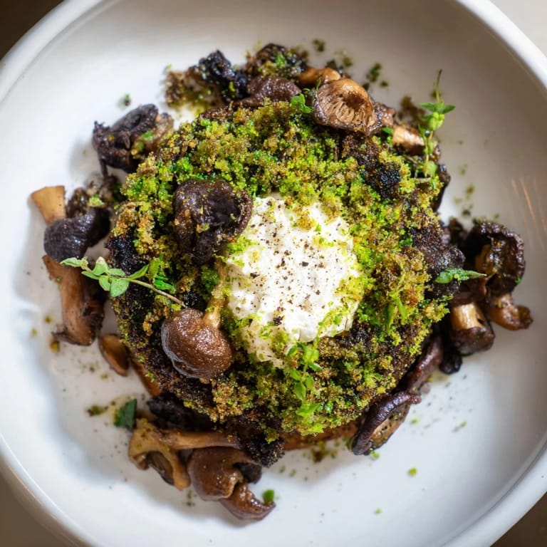 Merken Ein verspieltes, von der Natur inspiriertes Gericht mit sautierten wilden Pilzen, Kräuter-Moos-Semmelbröseln, geschlagenem Ziegenkäse und rustikalen Beilagen – ein Fest für die Sinne und die Fantasie.