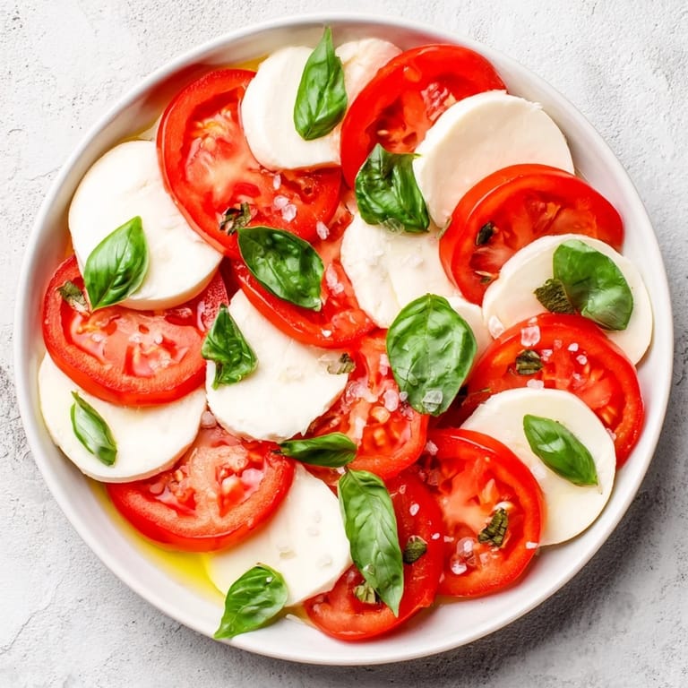 - Gemüse & Käse: 3 große reife Tomaten, in ½-Zoll-Ringe geschnitten, 250 g frischer Mozzarella, ebenfalls in ½-Zoll-Ringe geschnitten, 1 kleines Bündel frische Basilikumblätter