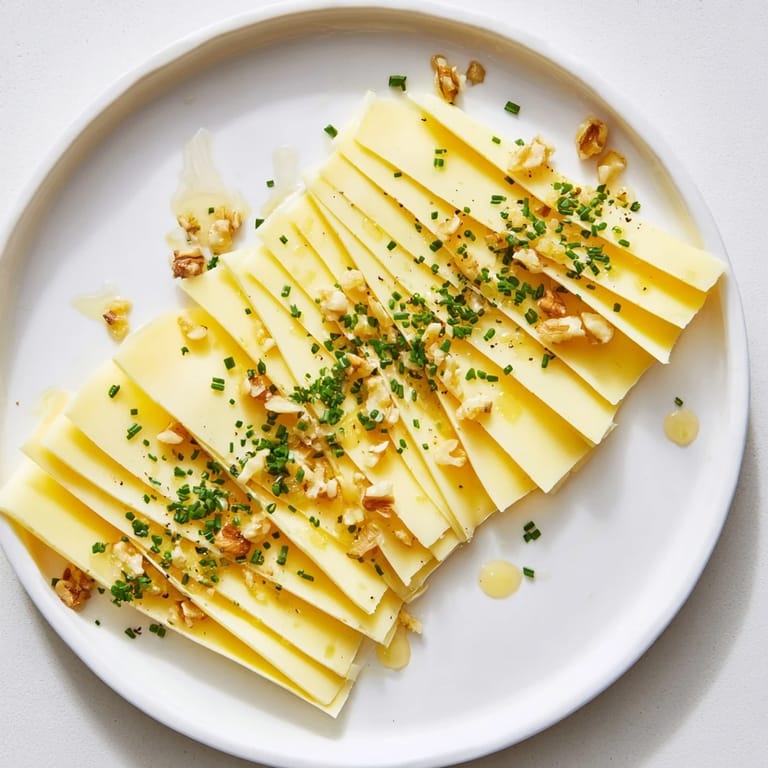 Merken Ein optisch ansprechendes und einfaches Vorspeisenrezept mit in Fächerform kunstvoll geschichteten Schweizer Käsescheiben, perfekt für Käseplatten oder als schneller Snack.