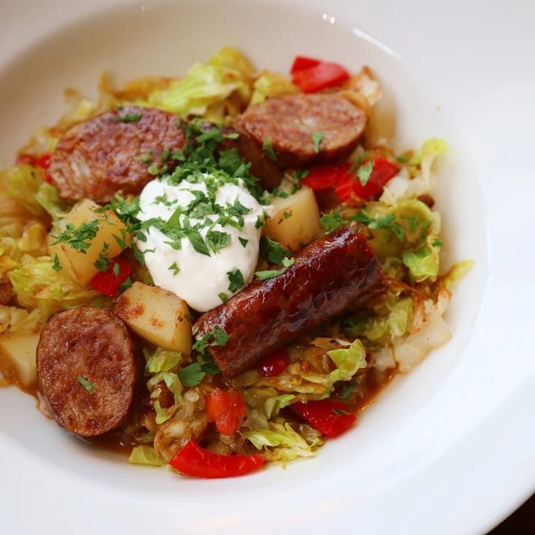 Merken Ein herzhaftes, gemütliches deutsches Gulasch mit rauchiger Wurst, zartem Kohl und wärmenden Gewürzen, perfekt für ein einfaches Abendessen unter der Woche.